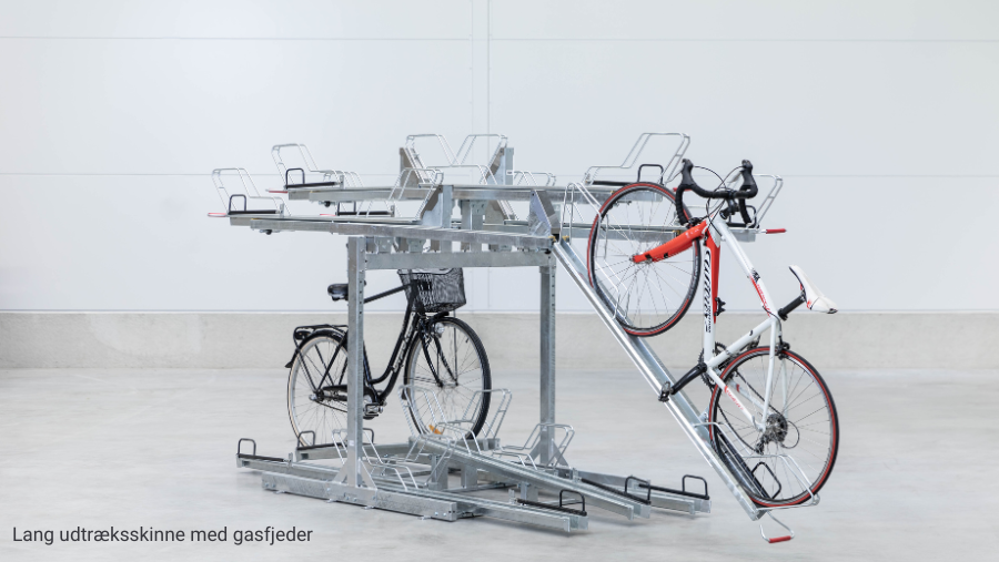 • Lang udtræksskinne med gasfjeder - For ekstra brugervenlighed. Gasfjederen gør, at cyklerne nemt kan løftes og sænkes, hvilket giver en jævn og ergonomisk parkering.