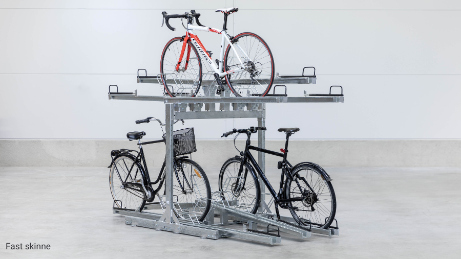 Vores dobbeltdækker-cykelstativ er en smart og fleksibel løsning. Det modulære system giver dig mulighed for at tilpasse og udvide dit cykelstativ over tid, afhængigt af dine behov og din plads. Vælg mellem forskellige skinneløsninger for at skabe den bedste parkering til din virksomhed: