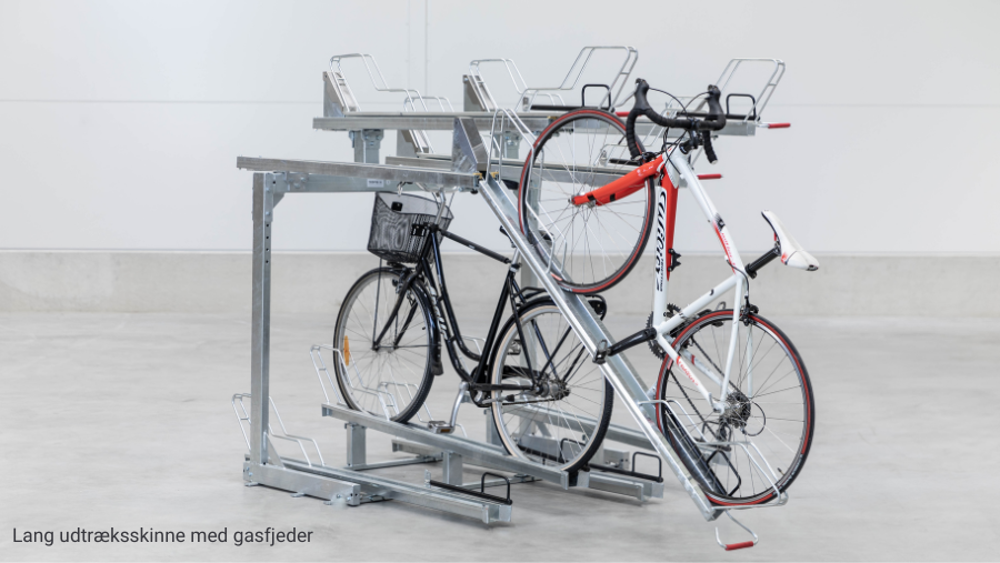 • Lang udtræksskinne med gasfjeder - For ekstra brugervenlighed. Gasfjederen gør, at cyklerne nemt kan løftes og sænkes, hvilket giver en jævn og ergonomisk parkering.