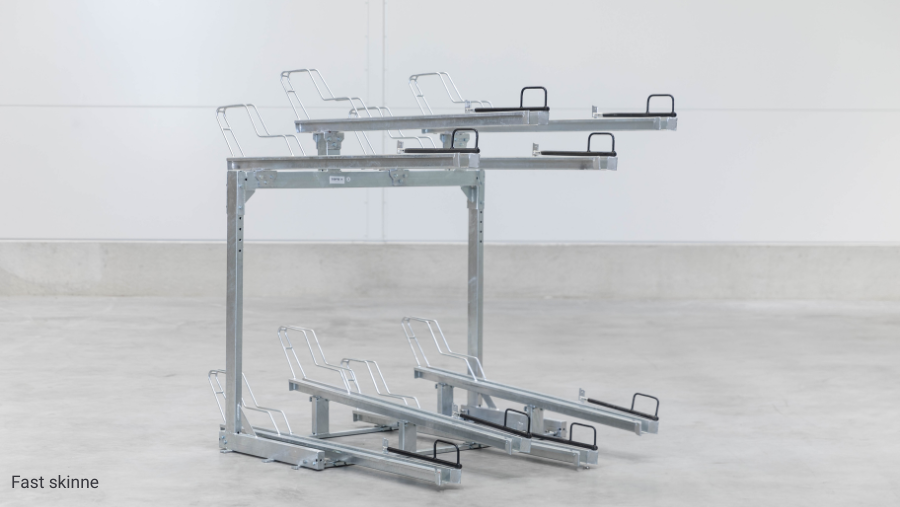 Vores dobbeltdækker-cykelstativ er en smart og fleksibel løsning. Det modulære system giver dig mulighed for at tilpasse og udvide dit cykelstativ over tid, afhængigt af dine behov og din plads. Vælg mellem forskellige skinneløsninger for at skabe den bedste parkering til din virksomhed: